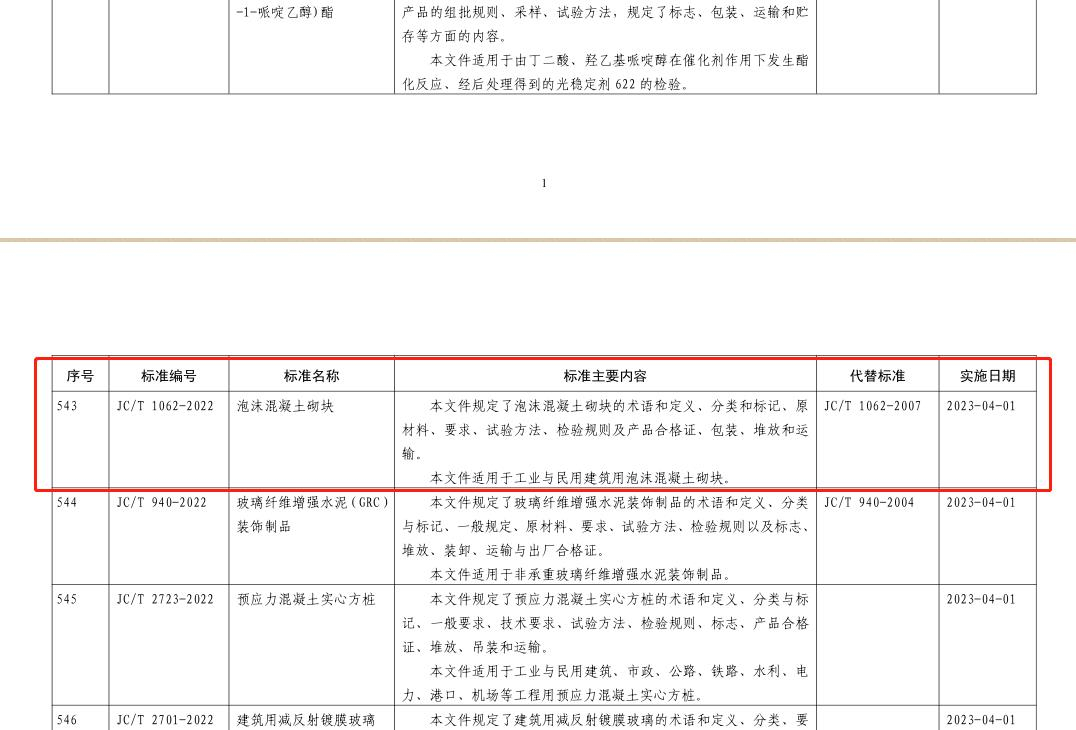 近日,從(cong)中華人民共(gòng)和國工業和(hé)信息化部網(wang)站第2022 年第 23 号(hao)公告了解到(dào),工業和信息(xi)化部批準建(jiàn)材行業 111 項的(de)通🔞知,行業标(biāo)準修改單及(ji)行業标準樣(yang)品自發布之(zhī)日起實施。其(qi)中包括批準(zhun)了《JC/T 1062-2022 泡沫混凝(níng)土砌塊》代替(tì)原有的《JC/T 1062-2007泡沫(mò)混凝土砌塊(kuài)》行業标準的(de)決定,該建材(cái)行業标準(含(hán)外文版)由中(zhōng)國建材工業(yè)出版社出版(bǎn),該行業标準(zhǔn)将于2025年11月30日(ri)實施。